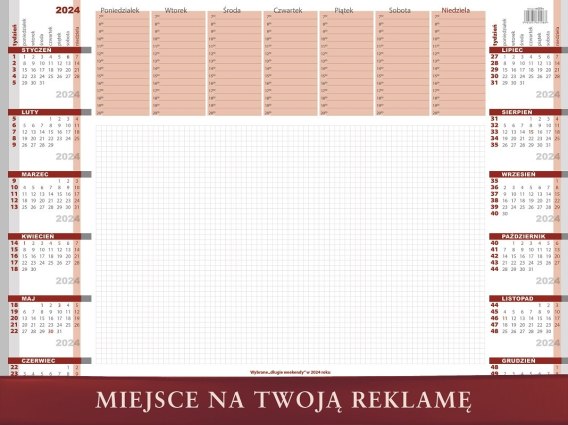 • Praktyczny podkład na biurko z dużym obszarem do notowania zaprojektowany specjalnie do biura. Drukowany na białym papierze. Zawiera 52 karty (1 karta przeznaczona na każdy tydzień). Biuwar posiada uchylną listwę wykonaną z PCV w kolorze bordowym, na której można zamieścić nadruk reklamowy na obszarze o wymiarach 550 x 40 mm.