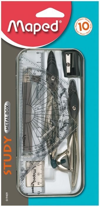 Zestaw geometryczny STUDY 10 - elementowy w metalowym pudełku zawierający: cyrkiel STUDY na grafity, cyrkiel STUDY z uniwersalnym uchwytem, linijkę, 2 ekierki, kątomierz, gumkę, ołówek, grafity i temperówkę. Blister.