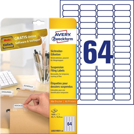 Et. na segegatory L6021REV-25 45,7x16,9 25ark na segegatory podwieszane, Avery Zweckform, białe, usuwalne
