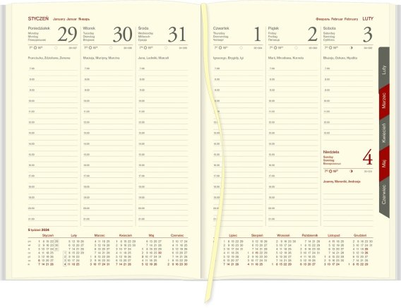 - tygodniowym na papierze kremowym nr A5TRK - wycianane registry miesięczne, żółta kapitałka i tasiemka.