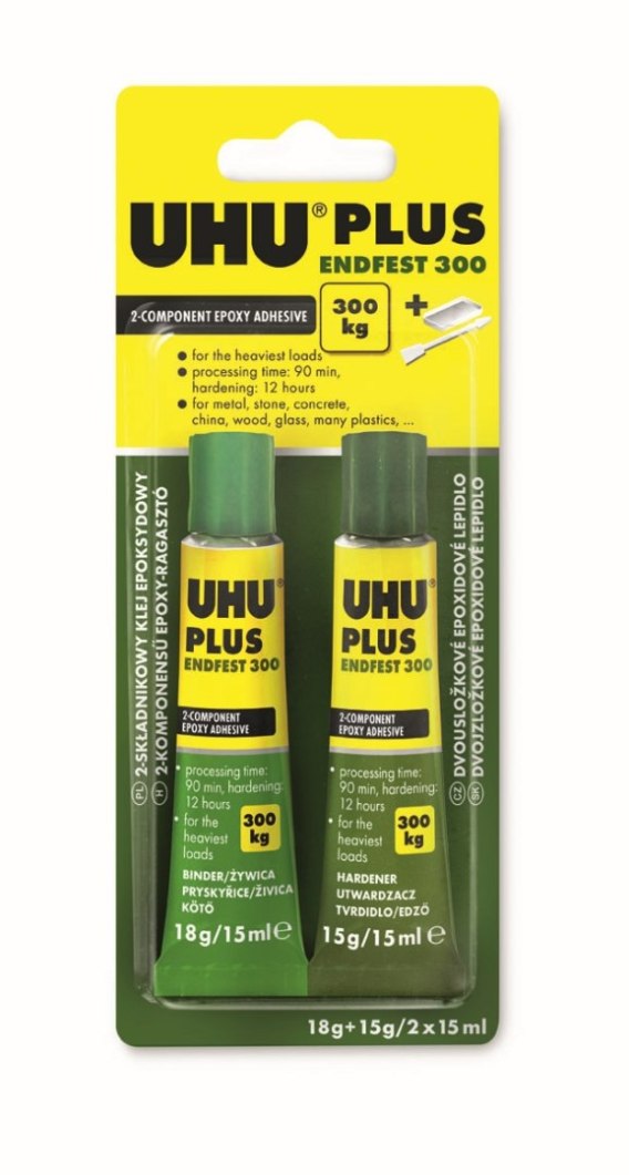 Klej epoksydowy UHU Plus Endfest 300 kg. Tubka 33 g. Uniwersalny, silny, dwuskładnikowy - na bazie żywic epoksydowych. Idealny do naprawy metalu, ceramiki, porcelany, kryształu, szkła, kości słoniowej, pereł, kamieni szlachetnych i różnych materiałów syntetycznych (poliester, bakelit, laminat, sztywny polistyren i szkło akrylowe (Perspex_). Nieodpowiedni do Polietylenu (PE), polipropylenu (PP), PTFE i kauczuku silikonowego. Bardzo mocny, odporny na temperatury od -30 _ C do + 80 _ C. Wodoodporny i odporny chemicznie. Wytrzymały na rozciąganie 300 kg/ cm2, czas użycia 2 godz. w temp. 20_C, czas utwardzania zależy od temperatury. Stosować tylko w temperaturze od +5_C do +35_C. Produkt utwardza się przez zmieszanie żywicy i utwardzacza. Podczas użycia rekomendowane użycie rękawic. Klejone powierzchnie muszą być czyste, suche i odtłuszczone (najlepiej acetonem). Gładkie powierzchnie zmatowić (papierem ściernym). W celu sklejenia należy wycisnąć równą ilość dwóch składników i wymieszać w załączonym pojemniku za pomocą syntetycznej szpatułki, do uzyskania jednolitego koloru. Mieszanina jest przydatna do użycia (w temp. pokojowej +20_C) przez ok. 1,5 h. Wystarczy nałożyć cienką warstwę kleju na jedną klejoną powierzchnię i złączyć klejone materiały, utrzymując bez zmieniania pozycji przez 7 godz. Plamy i pozostałości należy niezwłocznie usunąć ciepłą wodą i mydłem. Utwardzony klej można usunąć tylko mechanicznie. Przechowywać w chłodnym, suchym, zabezpieczonym przed mrozem i szczelnie zamkniętym miejscu.