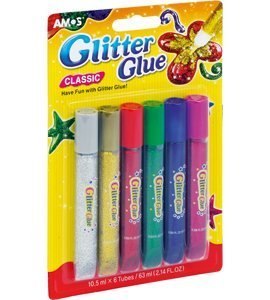 Klej z brokatem AMOS__dekoracyjny klej w płynie zawierający drobinki brokatu, przeznaczony do dekoracji_papieru, kartonu, drewna i innych powierzchni__wygodny: namaluj wzór za pomocą kleju i poczekaj aż zaschnie__nie wymaga dodatkowych akcesoriów__nie brudzi, nie rozsypuje się__po zaschnięciu drobinki brokatu nie wykruszają się__możliwe jest łączenie Glitter Glue z innymi technikami:_farbami witrażowymi, Ciasto-Plasto__zgodne z normą CE i z wymaganiami ACM Institute INC. USA__jednostka sprzedaży 1 opakowanie