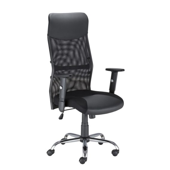 Krzesło obrotowe HIT czarne__ szerokie, komfortowe siedzisko i ergonomicznie _wyprofilowane oparcie__ wysokie oparcie__ oparcie i siedzisko tapicerowane połączeniem tkaniny _siatkowej i imitacji skóry oraz tkaniny w kolorze czarnym__ możliwość swobodnego kołysania się__ możliwość blokady siedziska i oparcia w pozycji _do pracy regulacja siły oporu oparcia__ regulowana wysokość krzesła__ regulowane podłokietniki z miękkimi nakładkami lub stałe podłokietniki__ podstawa chromowana__ samohamowne kółka do powierzchni dywanowych _w standardzie__ *HIT R - regulowane podłokietniki z miękkimi nakładkami