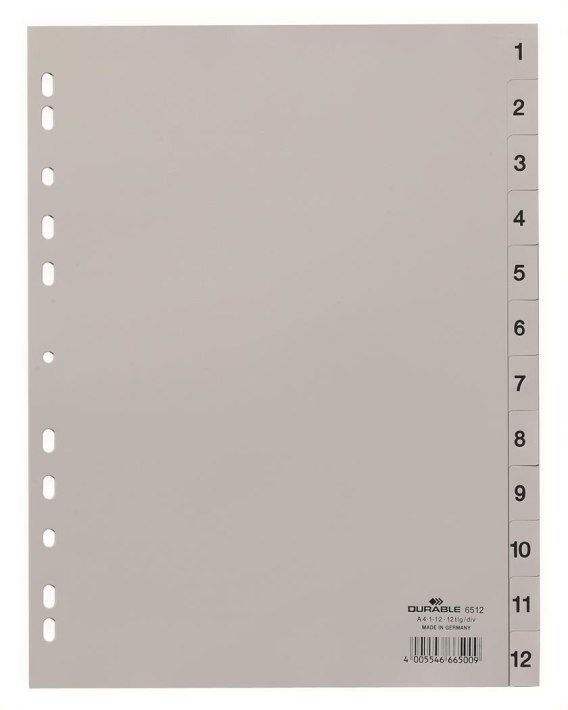 Przekładki PP A4 szare, nadr. indeks, 1-12, 1 0 części Szary 651210 DURABLE