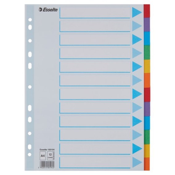 Przekładki kartonowe Esselte_- do formatu A4 lub A5_- z mocnego kartonu_- w 5 kolorach_- multiperforacja - pasuje do każdego segregatora_- z kartą informacyjno - opisową_- jednostka sprzedaży 1 komplet