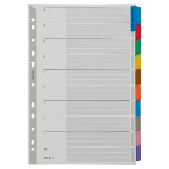 Przekładki kartonowe Leitz_- format A4 z mocnego kartonu 160 g/m__- kolorowe indeksy i perforacja wzmocniona folią_- multiperforowane - pasują do każdego segregatora_- z kartą informacyjno - opisową_- jednostka sprzedaży 1 komplet
