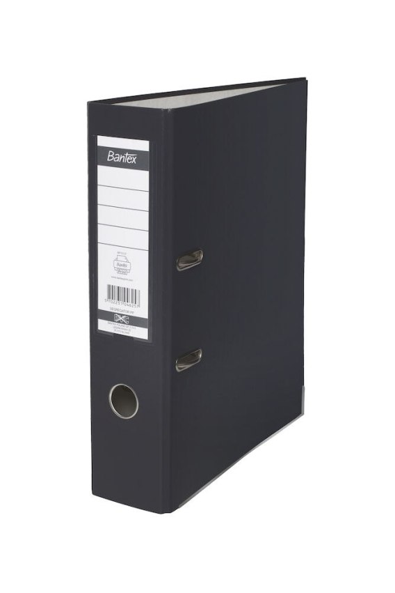 Segregator ekologiczny XXL z mechanizmem Bantex__oklejony na zewnątrz folią PP, wewnątrz biała i nabłyszczana wyklejka papierowa__dwustronna wymienna etykieta opisowa w kolorze segregatora__dwa okute otwory RADO w przedniej okładce__dolne krawędzie wzmocnione metalową szyną__jednostka sprzedaży 1 sztuka