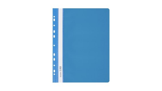 - folia PVC, przód twardy przezroczysty, tył twardy kolorowy_- boczna perforacja umożliwia wpięcie do segregatora z dowolnym ringiem_- w środku blaszka i wąs o długości 16,5 cm, umożliwiający wpięcie dokumentów do 2 cm_- wymienny papierowy pasek do opisu z kodem kreskowym na szt._- dwa wycięcia ułatwiające wysuwanie paska_- zaokrąglone rogi obu okładek