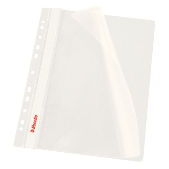 Skoroszyt wpinany Esselte_- skoroszyt formatu A4 z paskiem multiperforowanym umożliwiającym wpięcie do każdego rodzaju segregatora_- tylna okładka kolorowa, przednia przezroczysta_- wysuwany, papierowy pasek do opisu zawartości_- wykonany z folii PCV_- opakowanie 10 sztuk_- jednostka sprzedaży 1 opakowanie