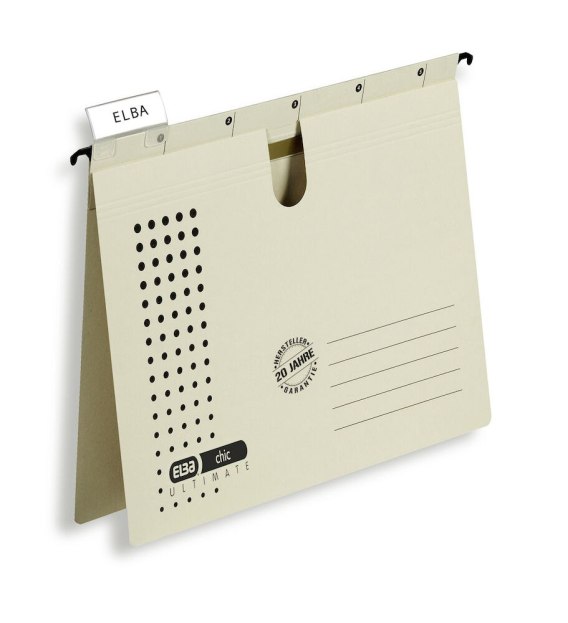 Skoroszyty zawieszane CHIC Elba_- mocny karton 230 g/m__- każdy skoroszyt wyposażony w szyld z wymienną etykietą opisową_- metalowe zapięcie skoroszytowe_- opakowanie: SKK220 - 50 sztuk, pozostałe pakowane po 25 sztuk_- jednostka sprzedaży 1 opakowanie