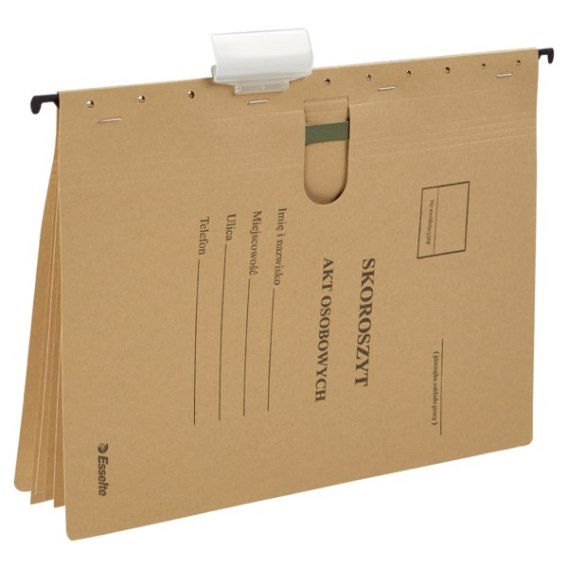 Teczka i skoroszyt zawieszany A4 na akta osobowe Esselte_- do przechowywania akt osobowych z mocnego kartonu 230 g/m__- wewnątrz 3 przegródki, w każdej mechanizm skoroszytowy umożliwiający wpięcie dokumentów (tylko skoroszyt)_- w komplecie identyfikatory i etykiety do opisu zawartości każdej teczki_- certyfikat BLAUE ENGEL dla produktów przyjaznych środowisku_-