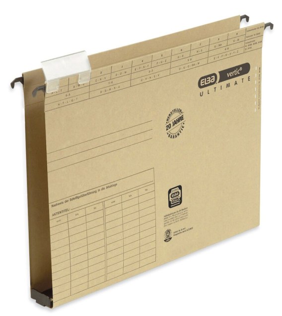 Teczki wiszące z poszerzanym dnem VERTIC ULTIMATE_- wykonane z mocnego kartonu CANSON o gramaturze 320 g/m__- wkładka plastikowa na dnie teczki z bocznymi ogranicznikami_- zwiększona pojemność i wytrzymałość_- przesuwny szyldzik z wymienna etykietą opisową_- dwie pary nacięć do pasków skoroszytowych E27592_- opakowanie - 25 sztuk_- dożywotnia gwarancja_- jednostka sprzedaży 1 opakowanie