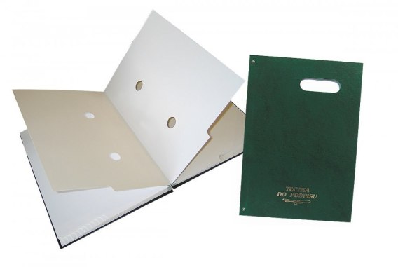 Teczka do podpisu z okienkiem Warta_- okładka twarda oklejana. Grzbiet harmonijka. Łączenie okładki z blokiem wzmocnione nitami. Na przedniej okładce okienko z szybką, pod którą można umieszczać napisy. _- blok z kartonu barwionego w masie zawiera 20 kart z 2 otworami i wyciętymi registrami_- jednostka sprzedaży 1 sztuka