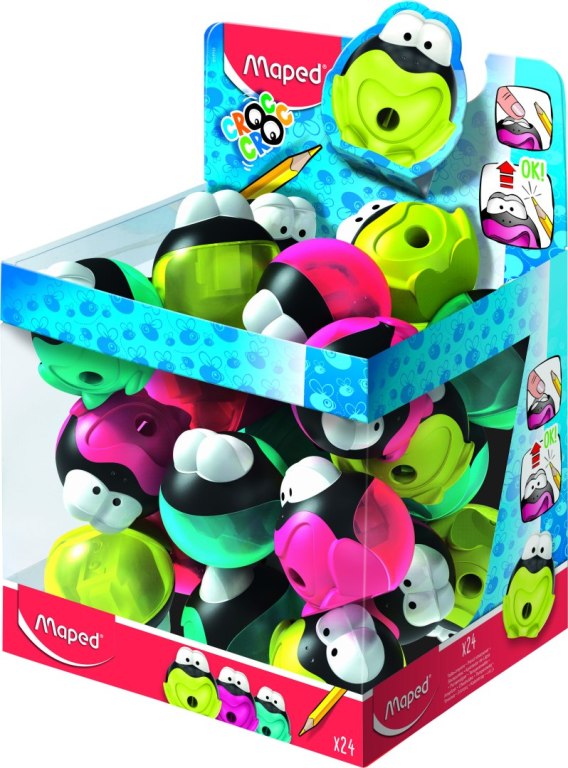 Temperówka Croc Croc Signal w kształcie żabki, która otwiera oczy sygnalizując, kiedy kredki i ołówki są już zatemperowane. Trzy wersje kolorystyczne: zielono-czarna, różowo-czarna i niebiesko-czarna. Jeden otwór. JS.: display 24 sztuki.