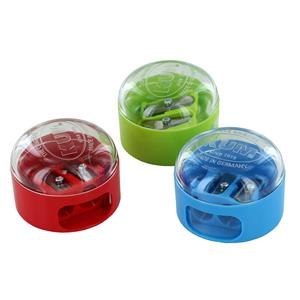Temperówka plastikowa KUM z pojemnikiem na ostrużyny w kształcie kopuły. Podwójna, wykonana z polistyrenu, przeznaczona do sześciokątnych lub okrągłych ołówków i kredek o średnicy 8 mm i 11 mm. Atrakcyjny design w modnych kolorach. Zamykany pojemnik z dodatkowym zabezpieczeniem otworów temperówki zapobiega przed wysypywaniem się ostrużyn. Wysokiej jakości ostrze ze stali wysokowęglowej solidnie połączone z obudową zapewnia precyzję temperowania i idealnie centralne położenie ołówka lub kredki. Technologia Dynamic Torsion Action dzięki odpowiedniemu napięciu i stabilności ostrza, poprzez jego delikatne wygięcie i mocowanie za pomocą wkrętu, minimalizuje ryzyko złamania grafitu. Wyprodukowana w Niemczech. Dostarczana w opakowaniu 12 szt.