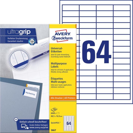 Technologia druku:•INK JET: Tak•LASER: Tak•LASER COLOR: Tak•KSERO: TakCechy produktu:•Rozmiar etykiety (mm): 48,5 x 16,9•Etykiet / arkusz: 64•Arkuszy/ opakowanie: 100•Etykiet/ opakowanie: 6400•Kolor: białe•Format: A4•Rzędów/ arkusz: 4x16•Certyfikaty: FSC