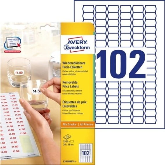 Usuwalne etykiety cenowe, A4, 25 ark./op., 26 x 16 mm, białe, AVERY ZWECKFORM, L3410REV-25