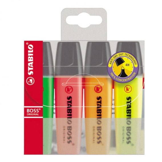 Zakreślacz STABILO BOSS, fluorescencyjny, 4 szt. w etui z wieszaczkiem